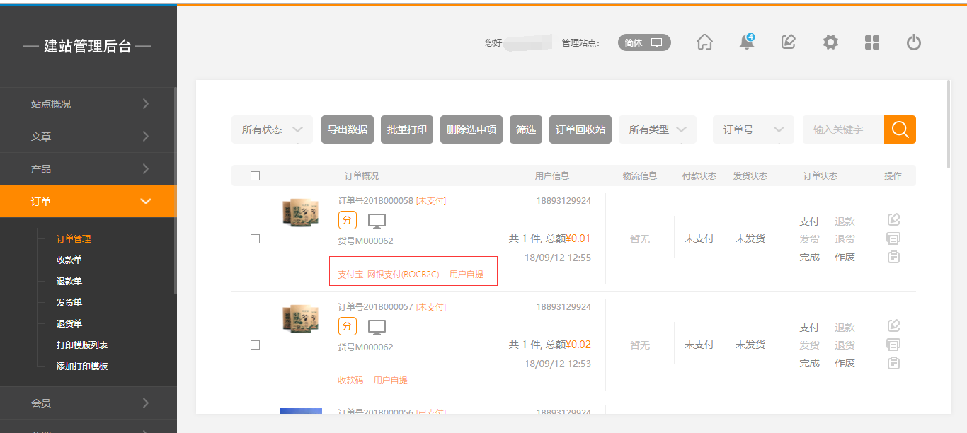 1. 在建站后台,“订单”-“订单管理”页面,当订单支付方式为微信且用户申请退款,现在只要配置正确证书,点击“保存”即可原路退款,如图所示: